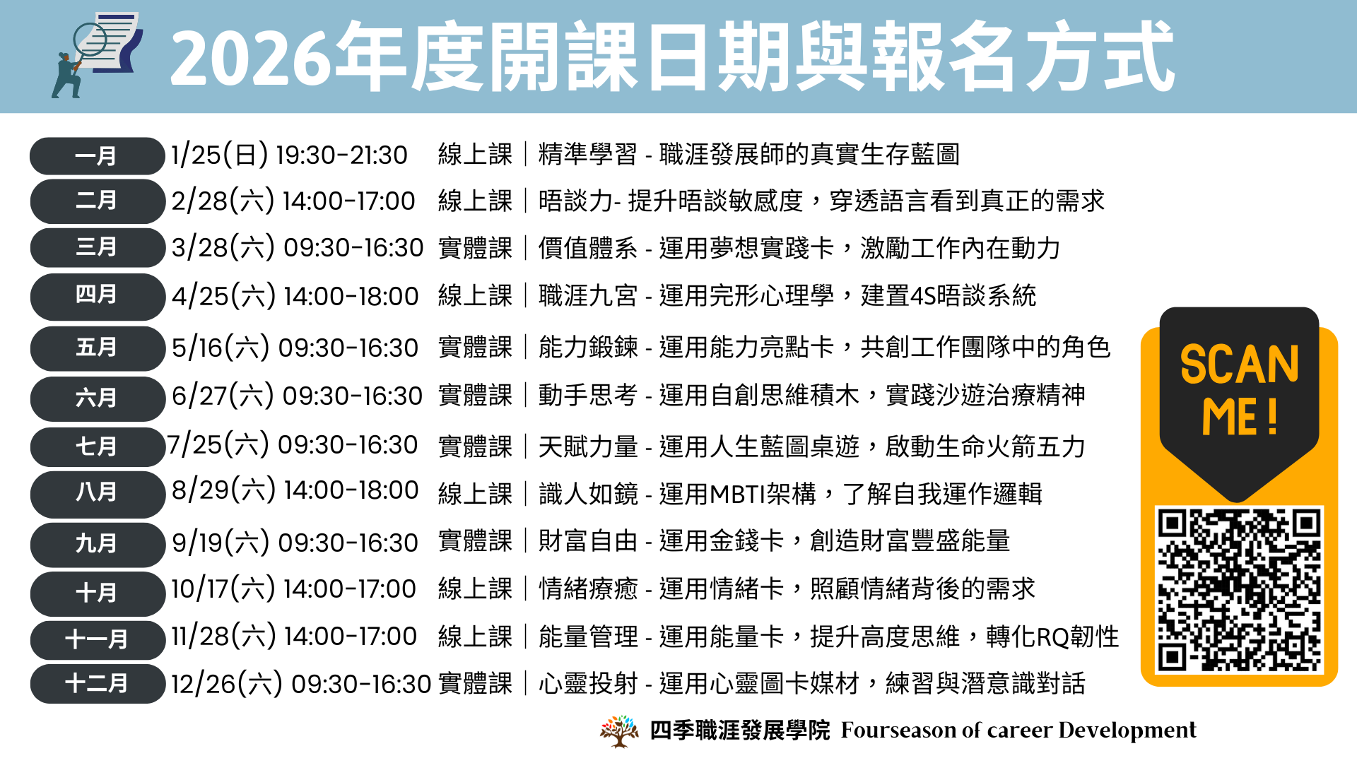 👉 如果你期待在新的一年,能「成為自己的職涯發展師」,歡迎加入這段旅程,讓我們一起創造屬於你的職涯四季。