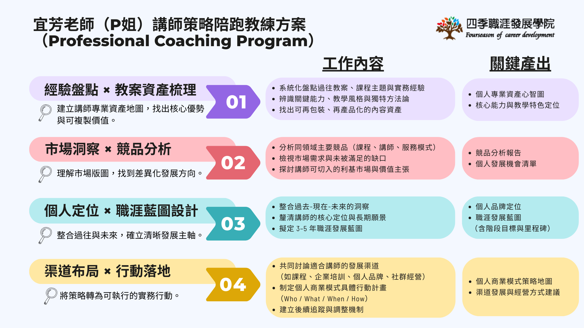系統化陪跑:非零散建議,而是完整四階段邏輯。